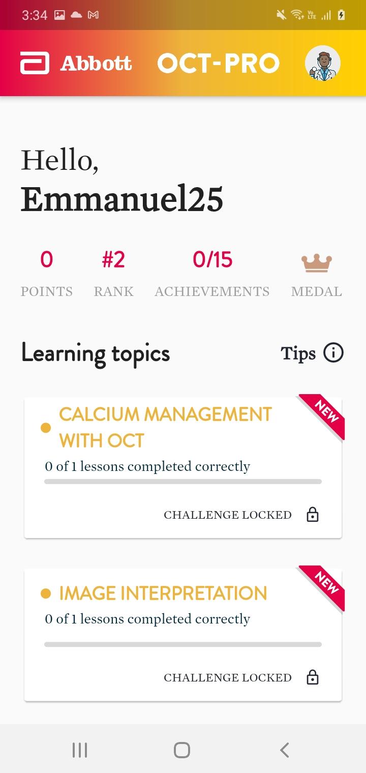 OCT-PRO is an educational app that provides learning for physicians and nurses to feel more comfortable using OCT. The user will have access to the different topics such as image interpretation and calcium management with OCT. Knowledge checks are available through dynamic games and challenges that need to be unlocked with a certain number of points. Finally the user will be able to see their ranking against their colleagues and other users of the app based on the number of correct answers.