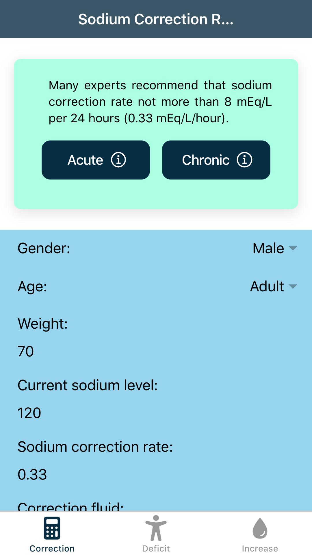 Corrrection of hyponatremia varies according to its source, its severity, and its duration. “Hyponatremia Calculator: Sodium Correction Rate” app will help you to determine the correct correction. Acute hyponatremia (duration < 48 hours) can be safely corrected more quickly than chronic hyponatremia.