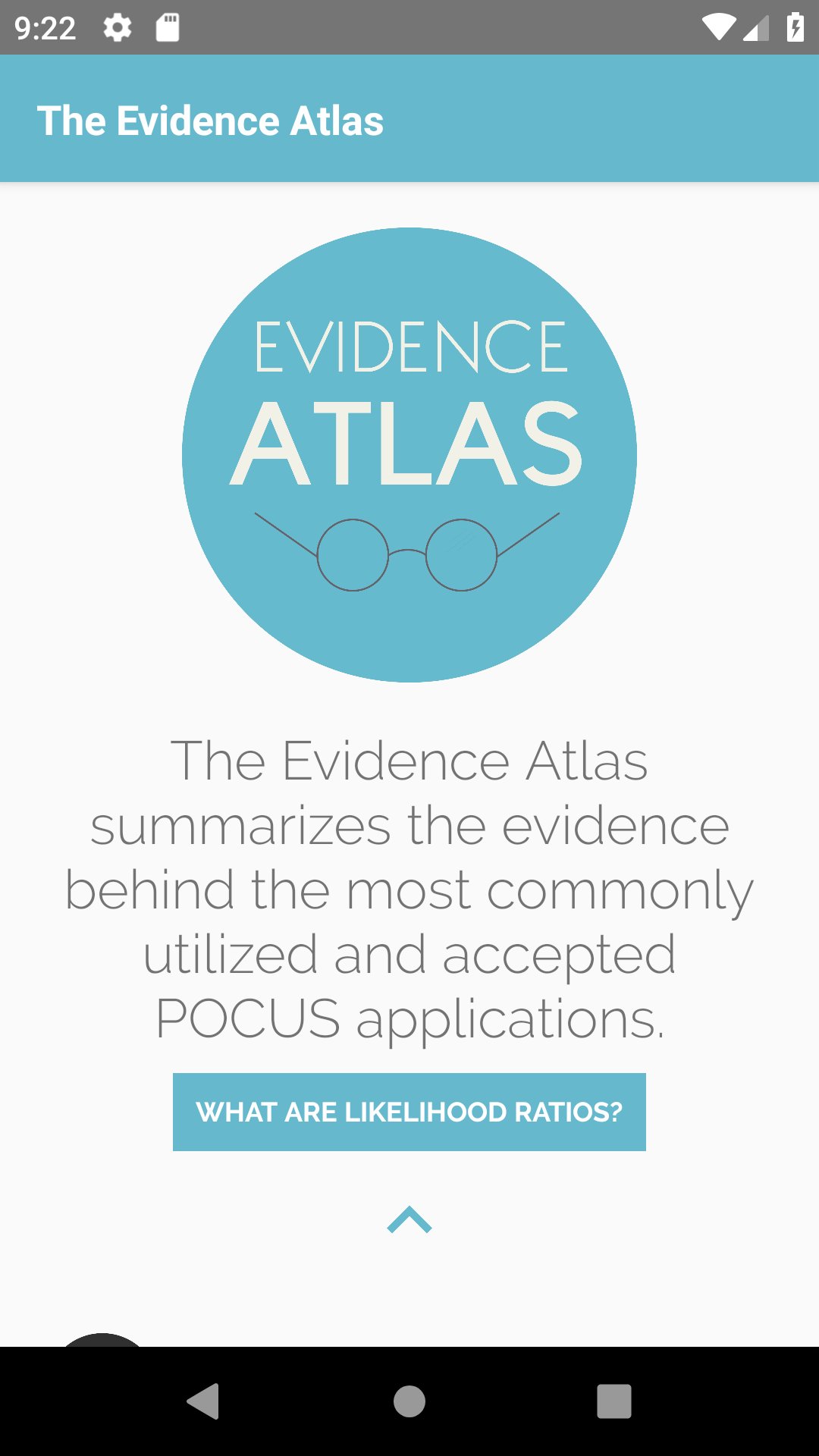 The Evidence Atlas (brought to you by The POCUS Atlas), provides a visual summary of the evidence behind the most commonly utilized and accepted point-of-care (POCUS) applications. Ideal for both learners and educators, this app serves as a quick bedside reference regarding the utility of POCUS findings in relation to a gold standard test. POCUS test characteristics are provided in both sensitivity/specificity and likelihood ratio format.