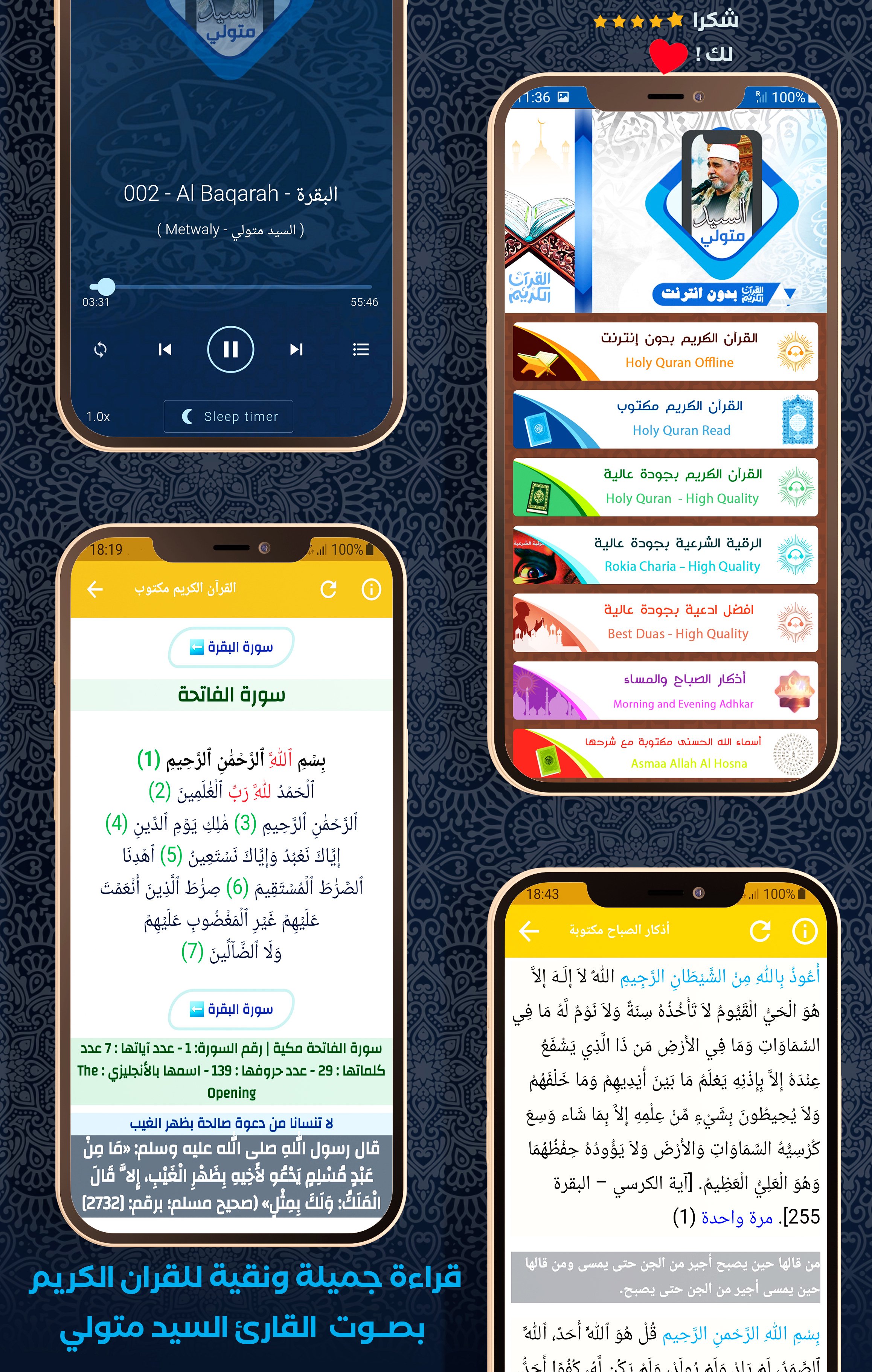 ⯌ The contents of the application: The Qur’an without the net, with the voice of Sheikh Al-Sayed Metwally, and it contains the written Holy Qur’an, morning and evening remembrances, and very wonderful supplications, and it also contains the legal recitation of high quality.