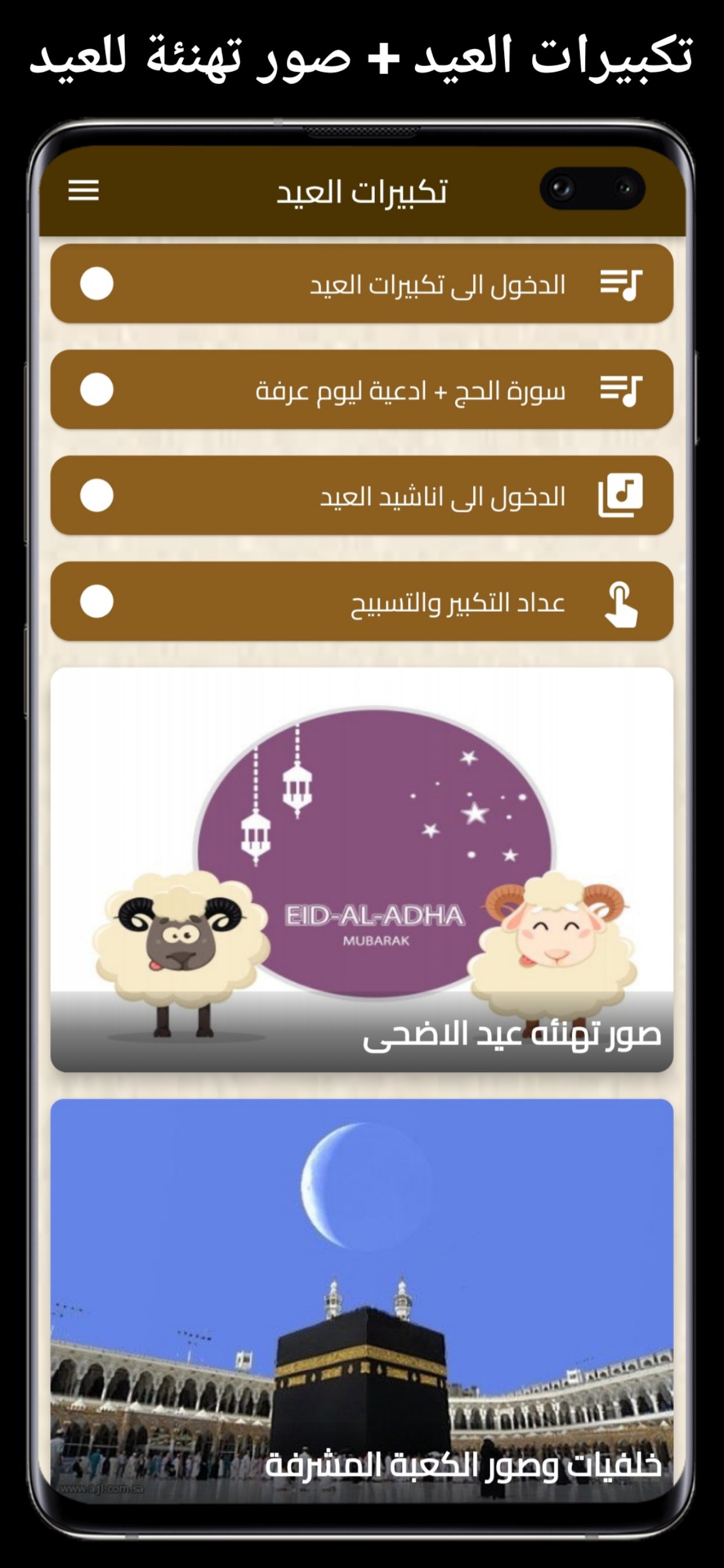 An easy and simple application to hear the most beautiful Eid takbeers on your mobile phone, the latest backgrounds and pictures for Eid Al-Adha greeting cards