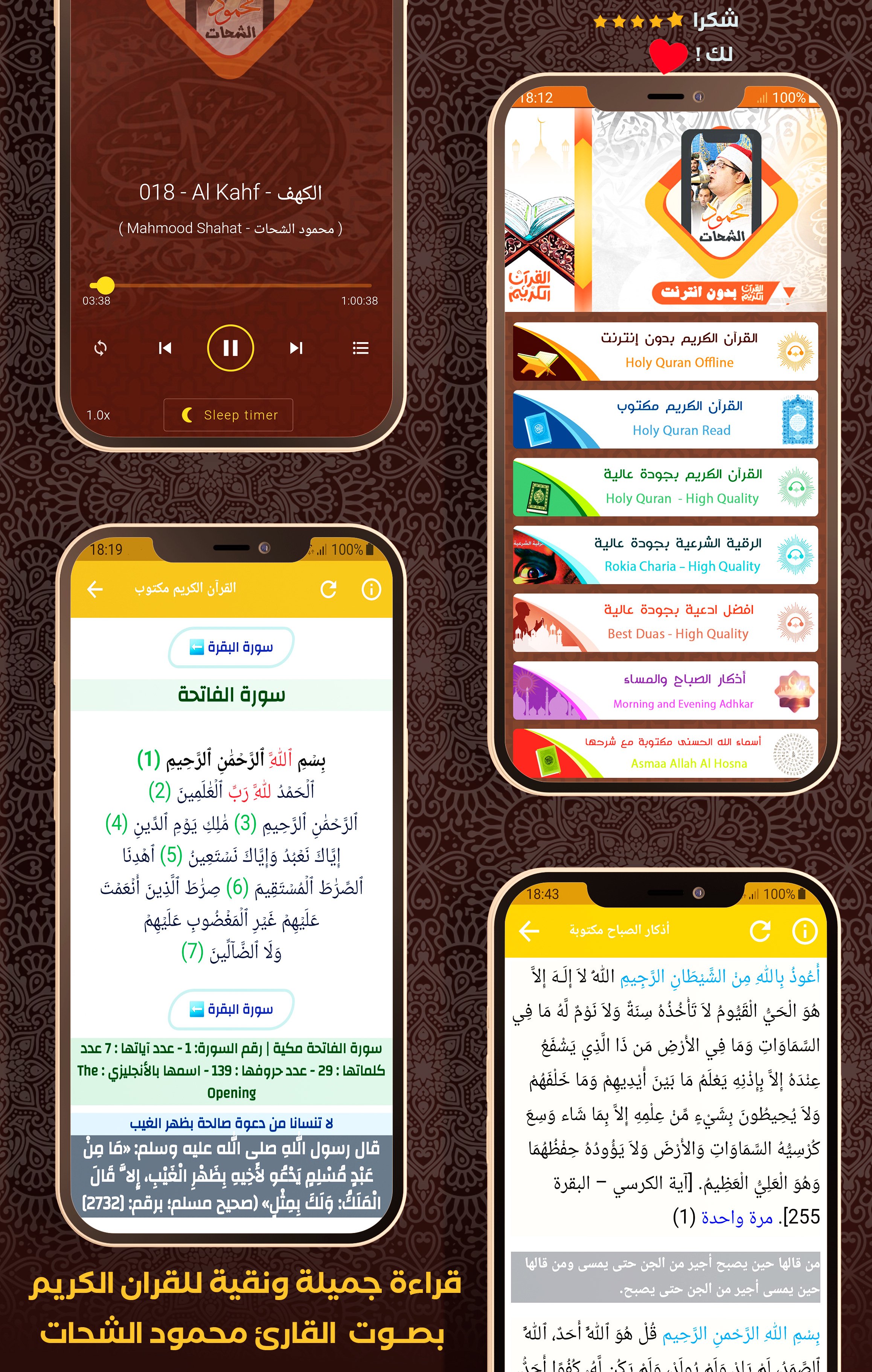 ⯈ This new application for the Holy Quran without the Internet provides access to the collection of exclusive Quran recitations, supplications, recitation morning and evening remembrances, with the voice of Shaykh Mahmood Shahat Anwar.