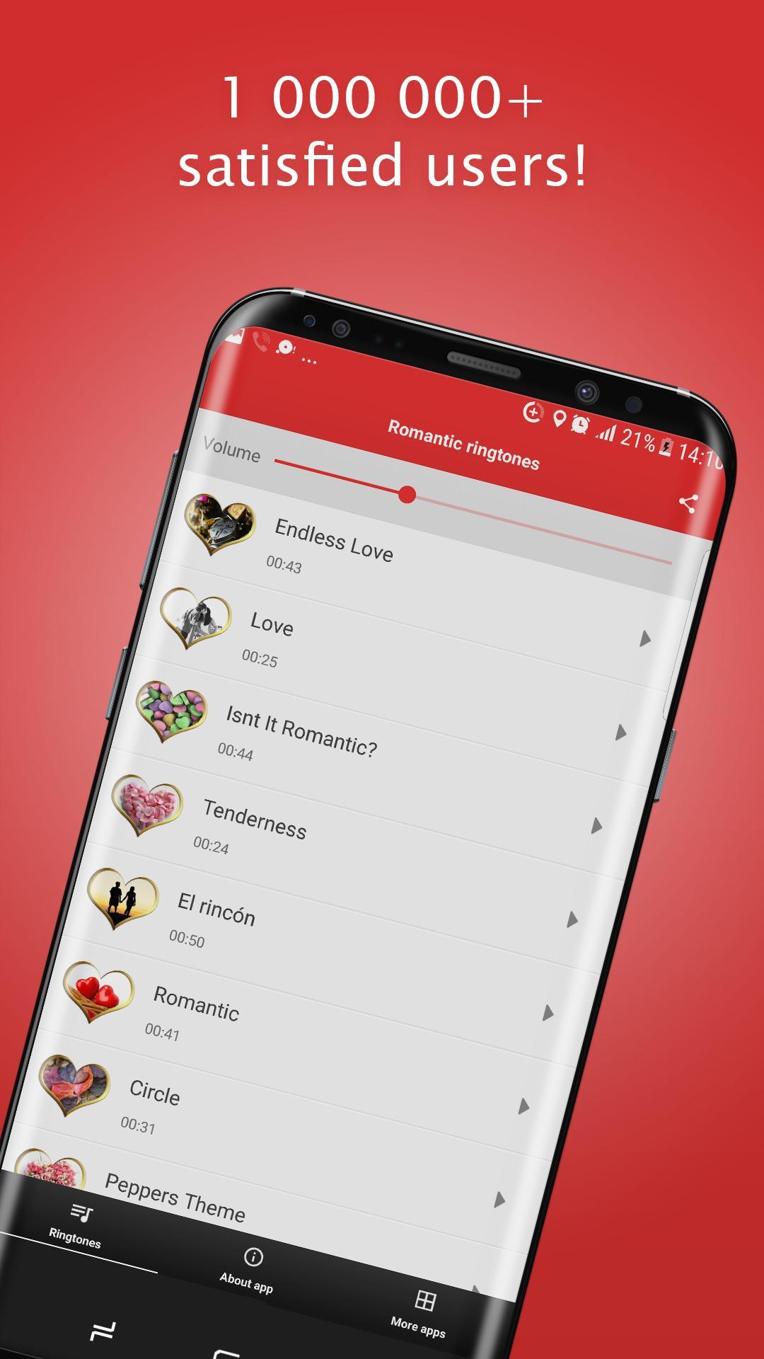 Let everyday be the Valentine`s day with free ringtones for androids. Whenever you`re with your significant other you can download free ringtones and create romantic atmosphere. Whoever you are in love with they will be pleasantly surprised when they hear romantic music playing on your phone. Get you and whoever you love in the right mood just download ringtones free with love music. Download free ringtones app and let love songs into your life.