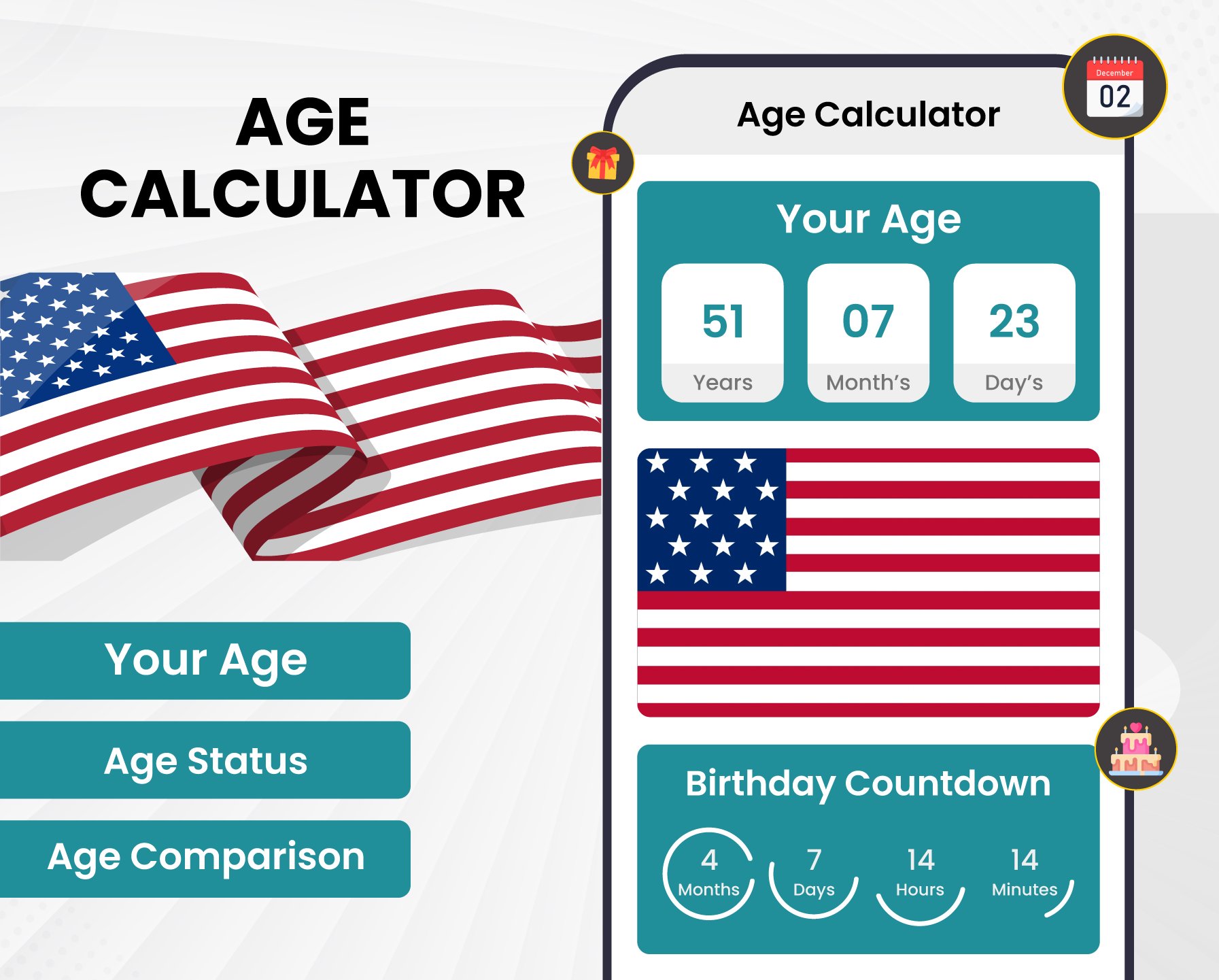 Know your exact age by using our age calculator by date of birth, Fact Age, Compare Ages, Workdays, Dog Age, Pet Age, Cat Age, Birthday Reminder, Planet Age, chronological age calculator or Style Greetings all in one place.