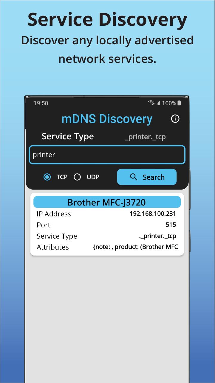 - Simply type in the service type you want to look for, for example printer, scanner, or smb. The app will resolve the IP Address, Port, and Attributes of the service if it's available.