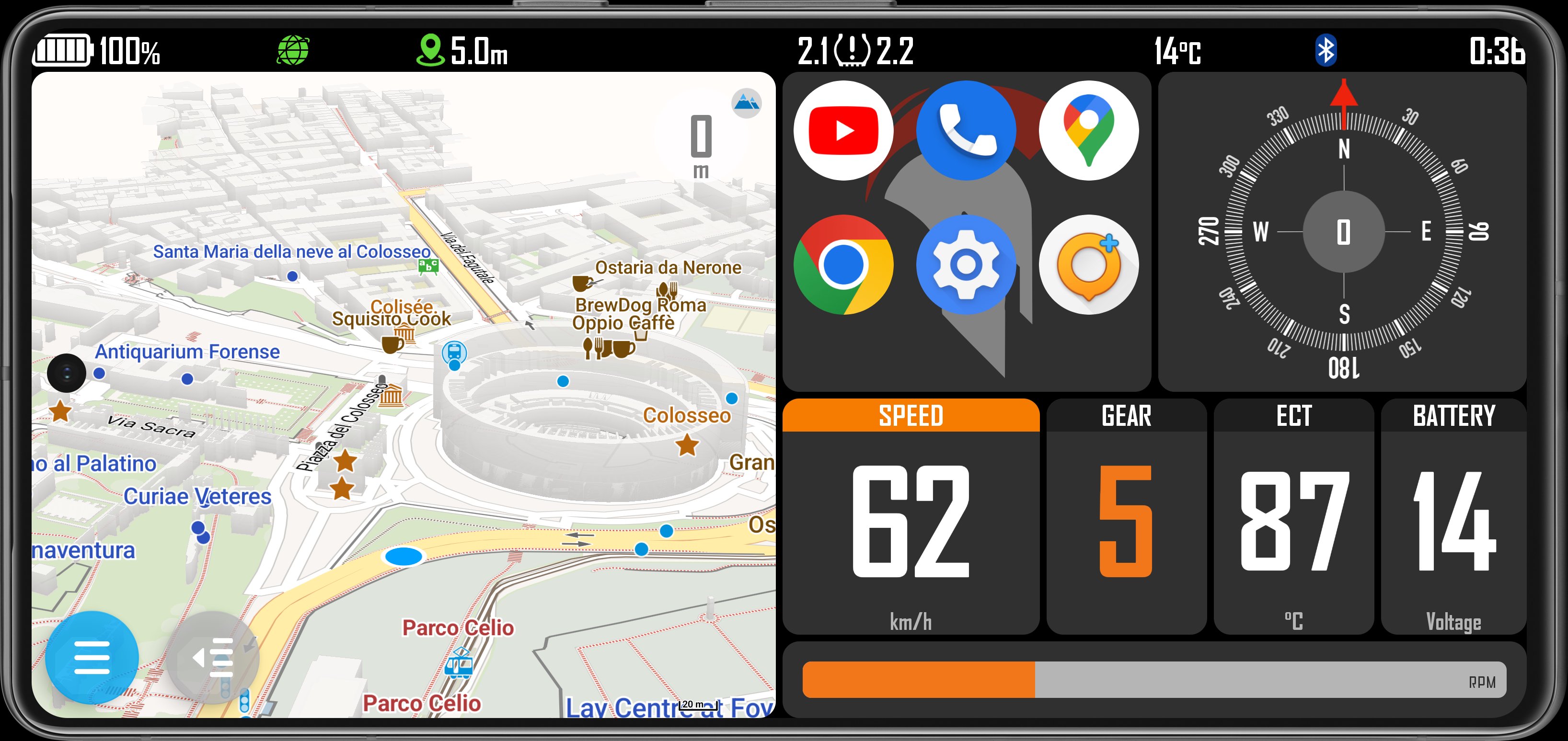 - Speedometer in real time, through the "SpeedoX miniBT" module that can be purchased separately; Display the vital data of the ECU (OBD2 standard compatible) of the motorcycle, such as: