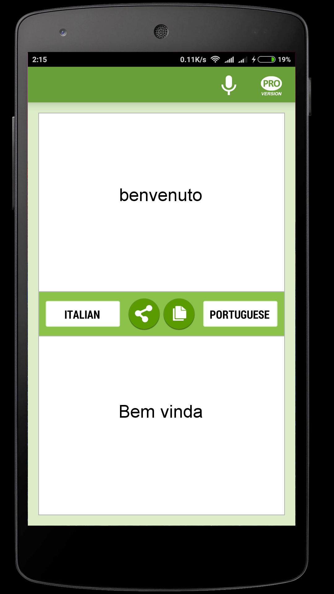 Italian-Portuguese translator - free, fast and easy to use, with a practical design and usability It allows you to translate words and phrases as text - to convert from Portuguese to Italian and Italian to Portuguese. You can use this converter to work, school, meetings, traveling or during business trips to improve your mastery of these languages, you can also use this as Italian-Portuguese-Italian converter, translator, dictionary. Try our application for easy conversion between languages.