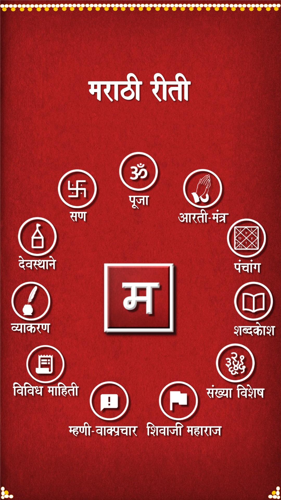 “Marathi Riti” mobile app is an amazing collection of Marathi Sanskriti/Culture which consist of Mantra, Shlok, Stotra, Aarti Sangraha,Sahasranamavali, Festivals, Devstane, Fasting, Puja, Panchang, Vyakaran, Shabdkosh, Mhani, Vakprachar, Numbers, Tables and much more information, which is available in audio form as well.