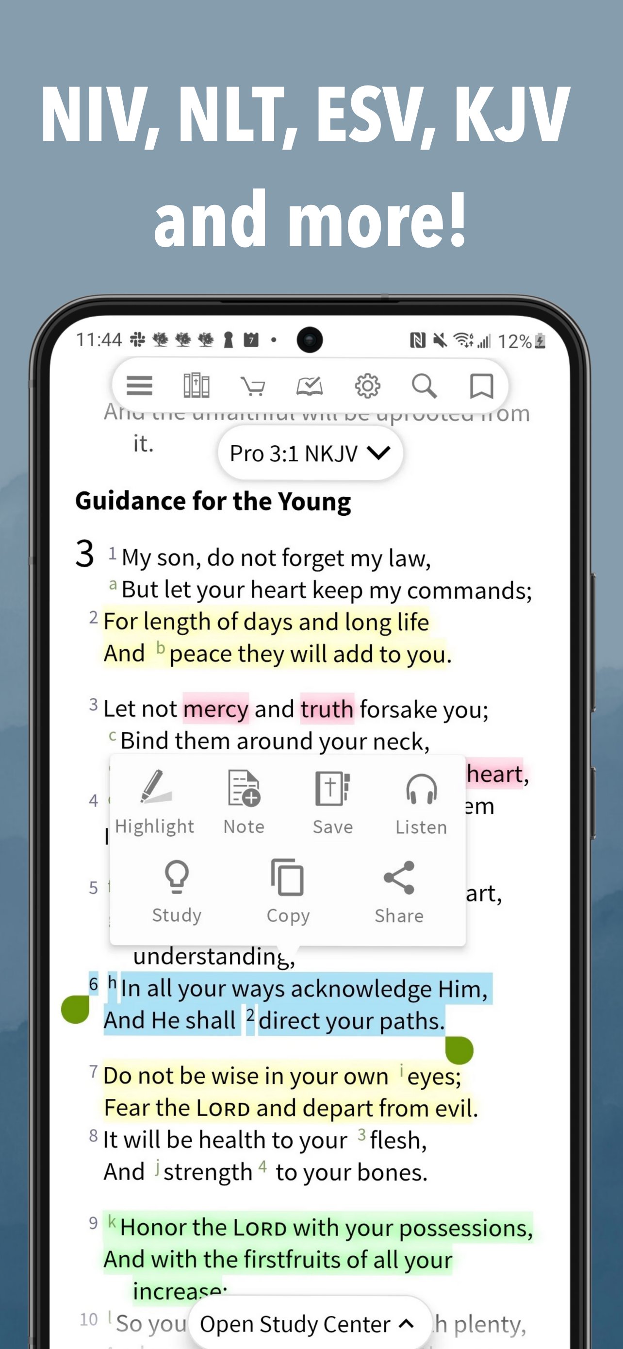 You can highlight and save your favorite passages, drop a book ribbon, create a note, add tags, and sign up to receive a daily Bible verse. Best part? Your highlights, notes, and resources sync between all your devices.
