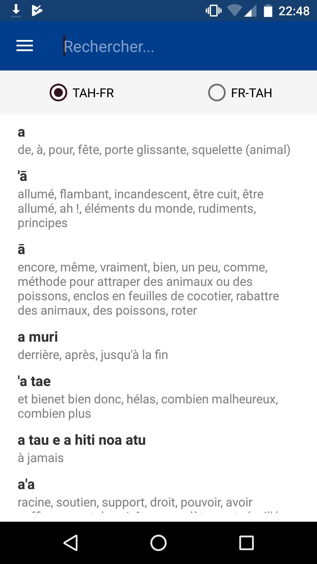 The lexicon of the Service of Translation and Interpreting is more than 16,000 words in Tahitian with their translation into French. A simple application, operating without an Internet connection, for beginners and experienced of the Tahitian language.
