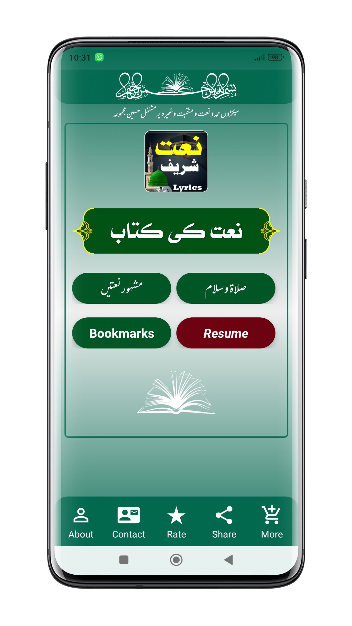 After installing Urdu Naat Sharif | نعت شریف اردو mobile App you can read all famous naatein (نعت پاک) and new naat and old naat sharif ki kitab urdu mein (نعت شریف کی کتاب) in Urdu Language with many useful features. In this application, you can read most beautiful naat in urdu lyrics (خوبصورت نعت شریف).