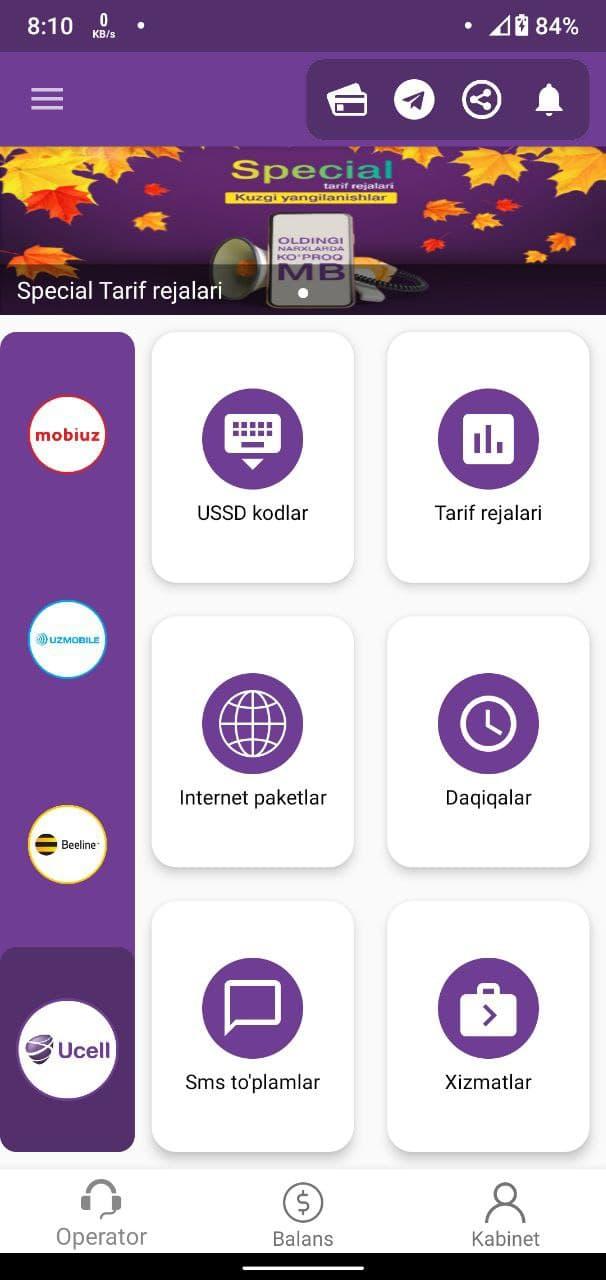 Ushbu ilova sizga 4 aloqa kompaniyalarining (Ucell, Beeline, Mobiuz, UzTelecom) barcha turdagi xizmatlarini (Tariflar, Internet, Sms, Daqiqalar, Ussd) taqdim etadi.
