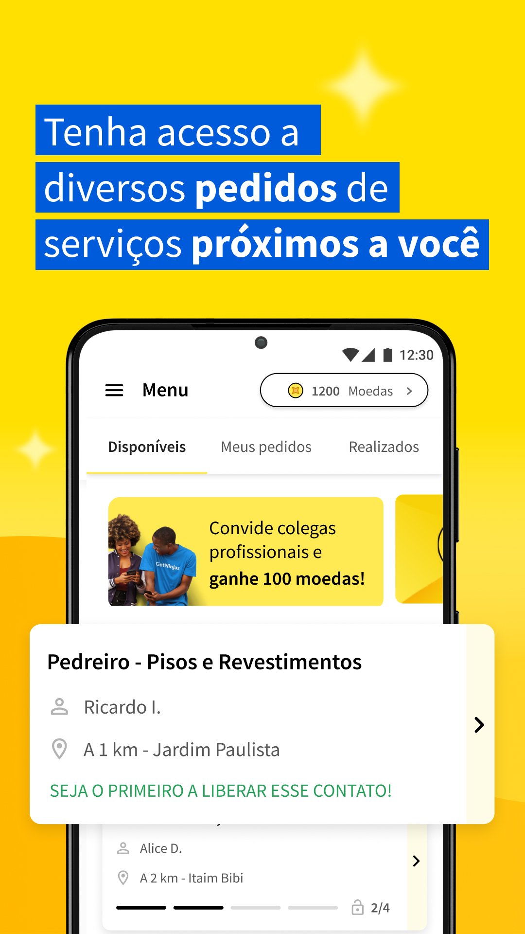 If you are tired of looking for job openings or freelancing work online, download “GetNinjas for Professionals” and be a self-employed professional!
