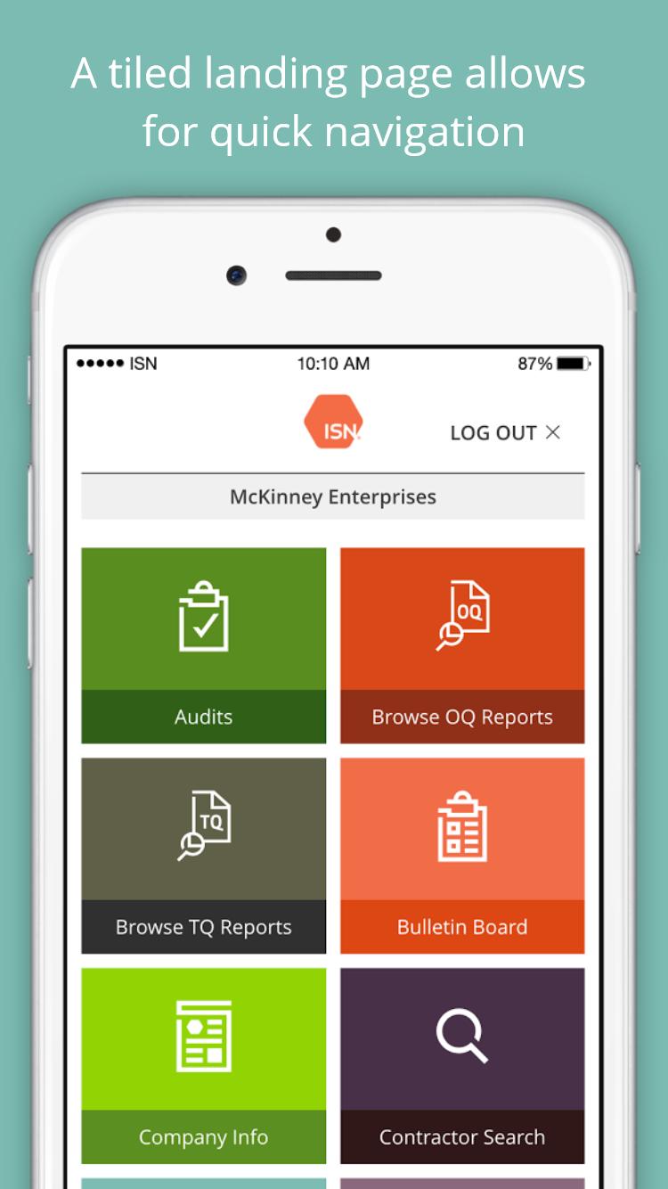 ISN’s mobile app provides customers access to its online contractor management platform, ISNetworld, via smartphone and tablets, anywhere an internet connection is available. Hiring Clients can confirm a contractor’s compliance, add evaluation reports and access OQ and TQ reports via their mobile device. Contractors can view their scorecard and requirements by Hiring Client, provide their employee ID and barcode for scanning as well as read important bulletins and messages from their clients within the app.