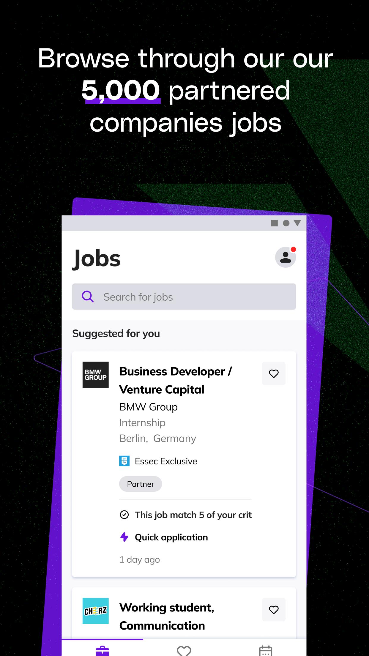 Find your dream job on the JobTeaser app dedicated to students, and let recruiters come to you! With our 4,000+ partnered recruiters (among which BWN, Henkel, Zalando, Amazon, Deutsche Bahn to name a few…) it doesn’t matter if you are looking for an internship during your studies or a full time job right after you graduate: JobTeaser has your back.