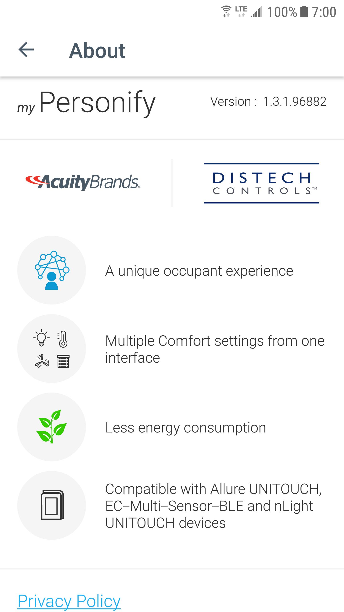 Welcome to my Personify, the app that allows you to easily customize your comfort settings directly from your mobile device when connected to a suitable room device (Allure UNITOUCH, EC-Multi-Sensor-BLE, nLight UNITOUCH) designed by Distech Controls (an Acuity Brands company).