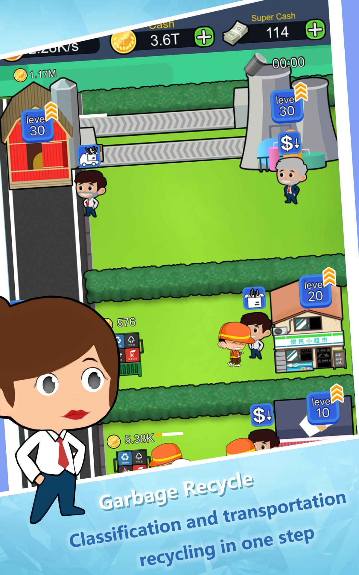 In the game, you can run a city's garbage recycle system yourself. Garbage classification and recycling is realized by operating cleaners, car, and recycling machines. Manage your city, hire managers to automate recycling, and get paid even offline. You can also open your factory in other cities and start your recycling kingdom.