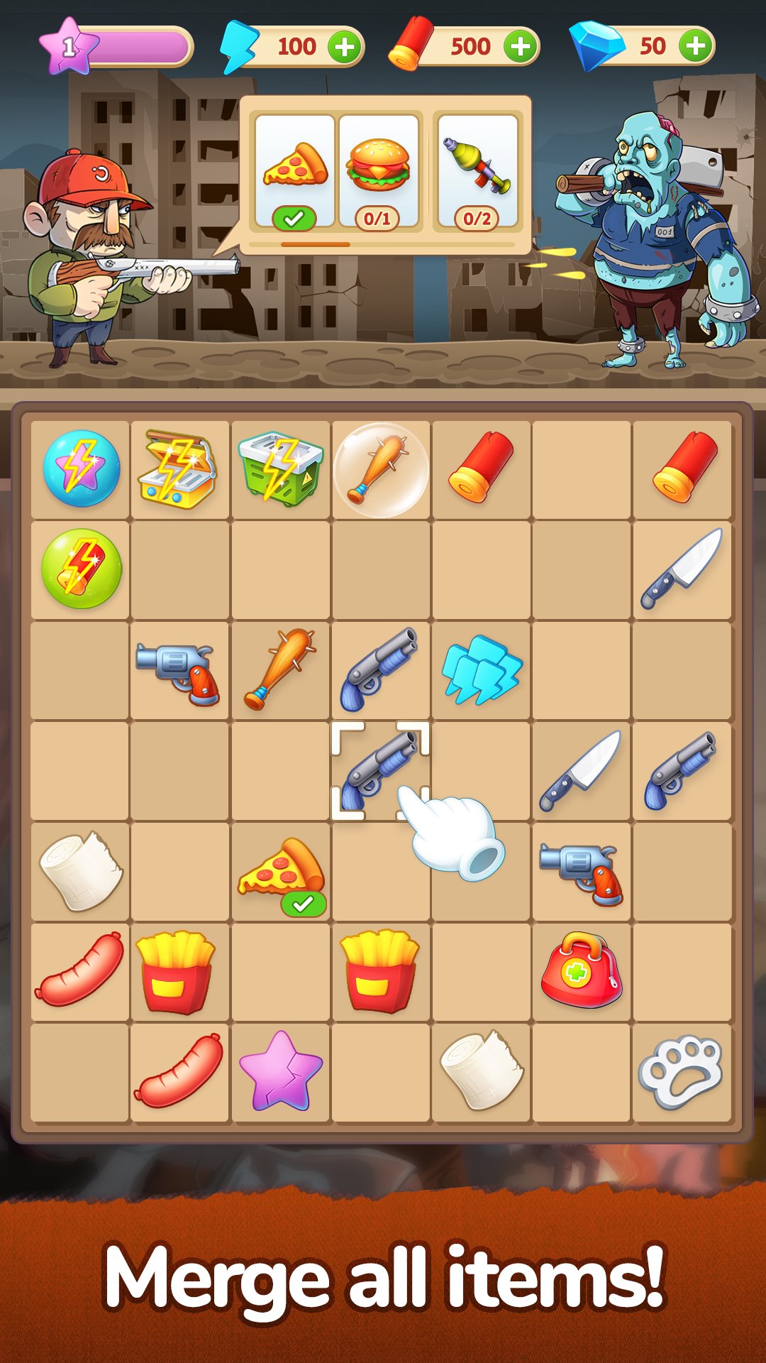 MERGE. Combine existing items to get new, bigger and better ones. Start with basic brass knuckles and get a rifle or something even cooler!
