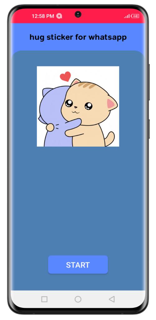 after you download hug stickers for whatsapp app A home page will appear with a title hug stickers for whatsapp and a button start and a hug gif image , click at the button start to enter to the app hug stickers for whatsapp and you find 4 or 5 categories of stickers hug couple and hug in bed and hug anime and hug in rain and a title hug stickers for whatsapp
