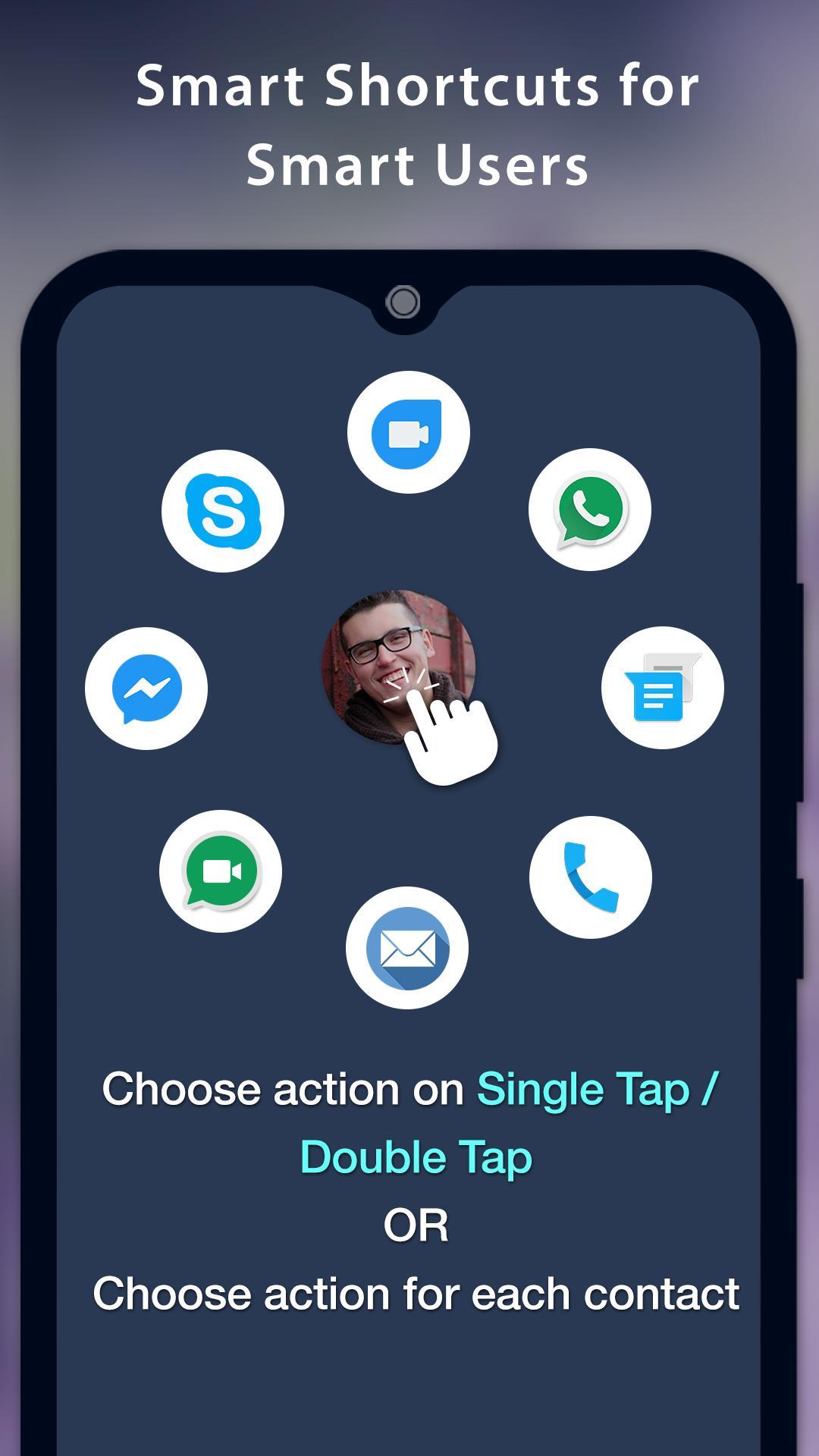 1) Just one tap and do Actions : Phone Call , SMS , WhatsApp message, WhatsApp Call , Skype call, Facebook messenger, Google Duo Video call.