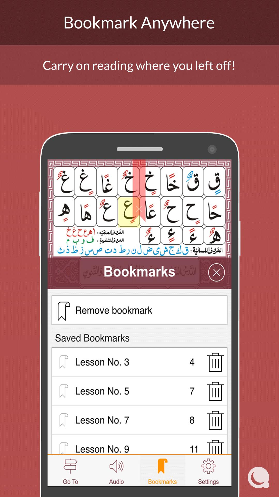 This app follows the progressive/step-by-step format starting from recognition of alphabets to reading complete sentences from the Quran using the correct pronunciation (tajweed) rules of reciting in Arabic style.