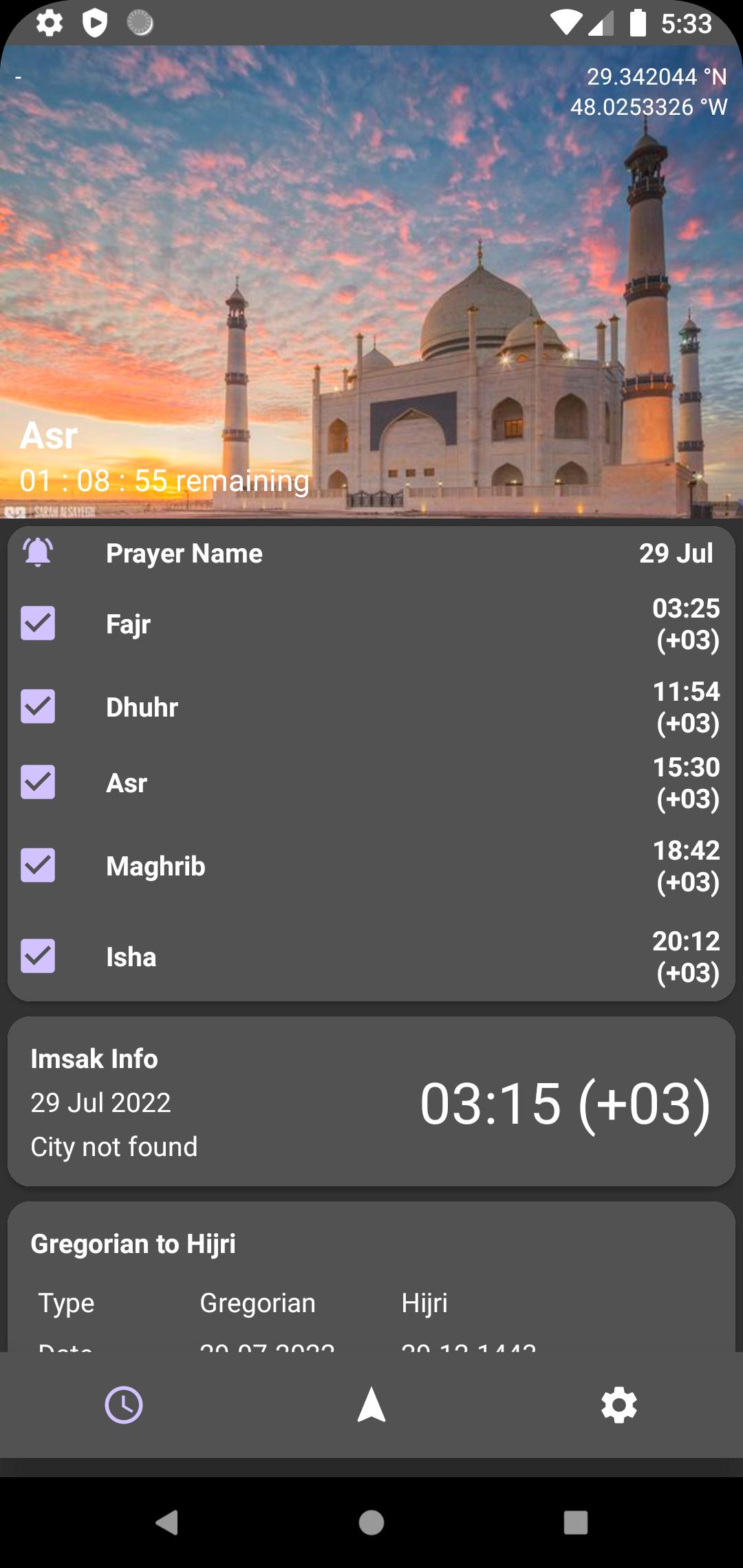 Free Prayer times, azan salat Kuwait. In this application, you can find information about the prayer schedule in the Kuwait City prayer schedule, Kuwait City.