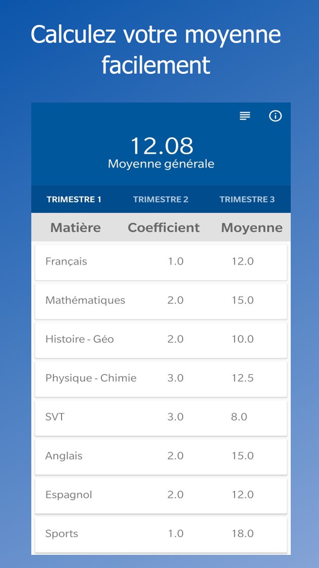 The general and quarterly average are calculated automatically according to the coefficients, the subjects, the quarters and the notes recorded. Then your data is saved on your device.