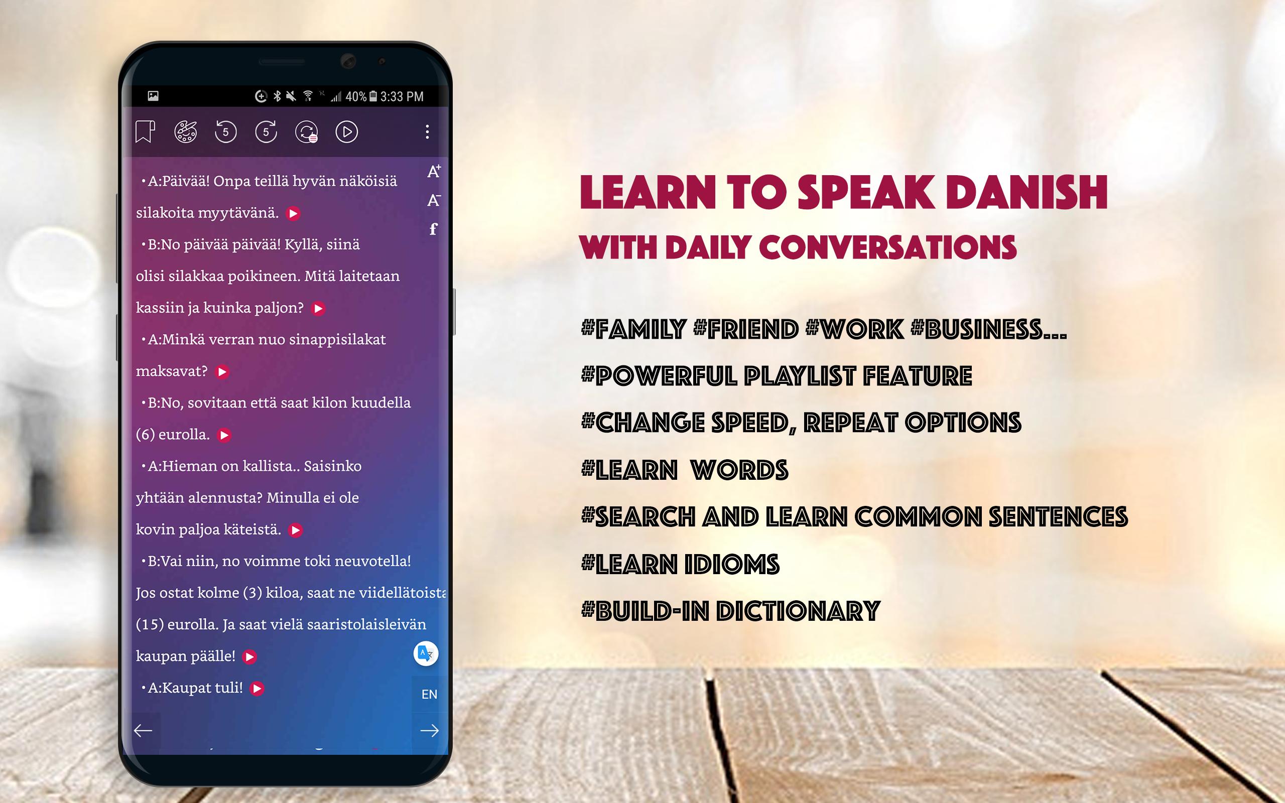 Learn to speak Danish through hundred of real-life conversation dialog is the most effective way to learn Danish. Emphasize listening, the app helps you to improve your listening skill, pronunciation, know how to ask and answer in daily talking.