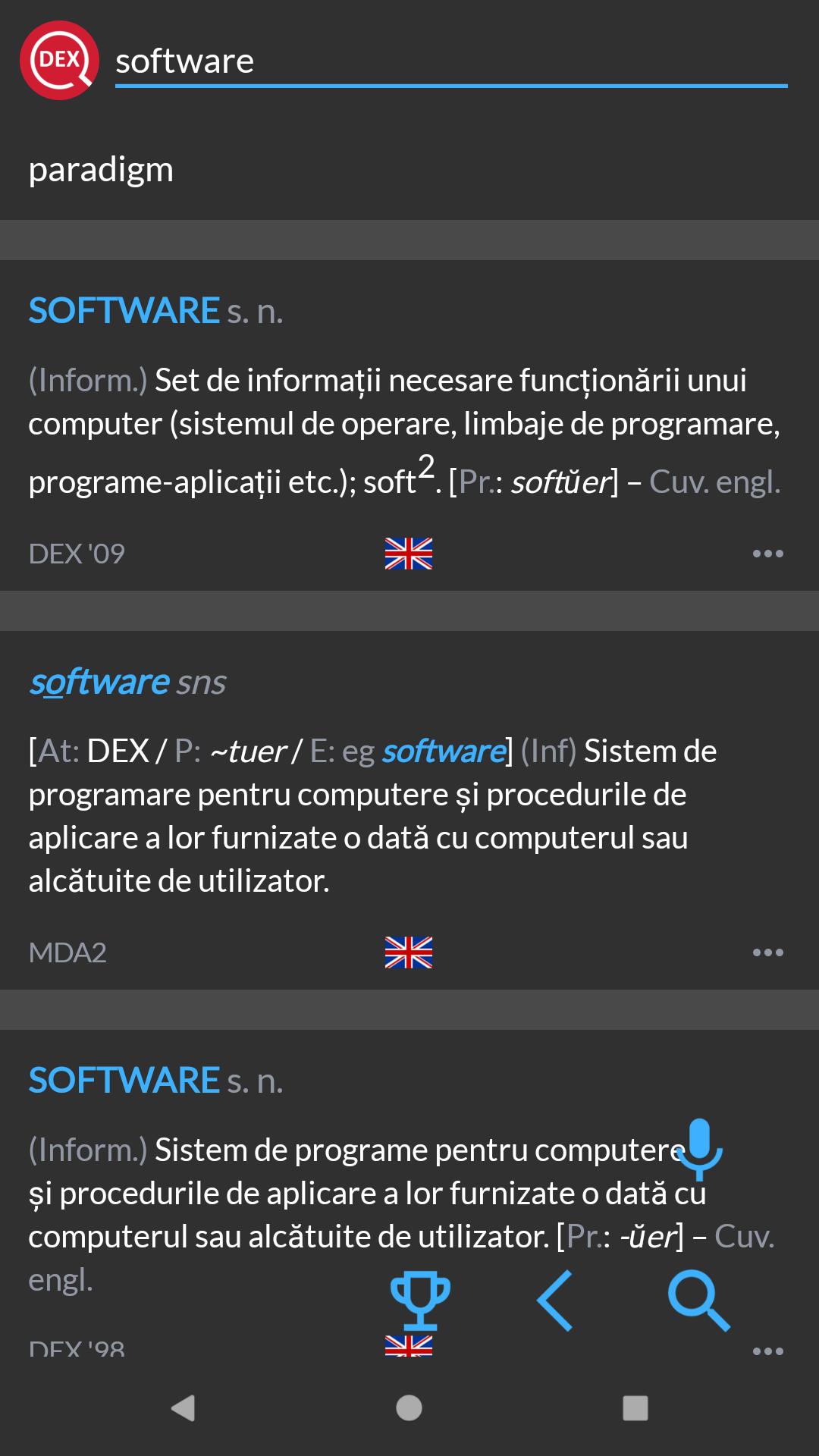DEX for Android is an OFFLINE and online Romanian Explanatory Dictionary (Dicționar Explicativ Român) based on the well-known http://dexonline.ro, while being packed together with educational games and containing many options for configuration.