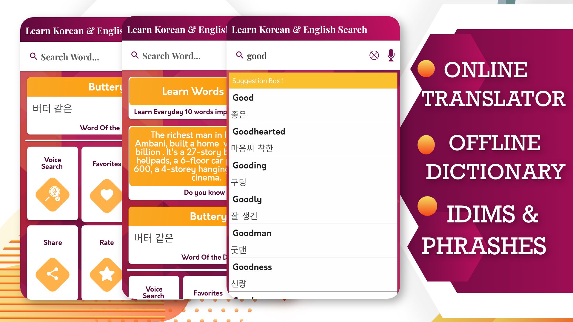 Features available in English to Korean Dictionary :-