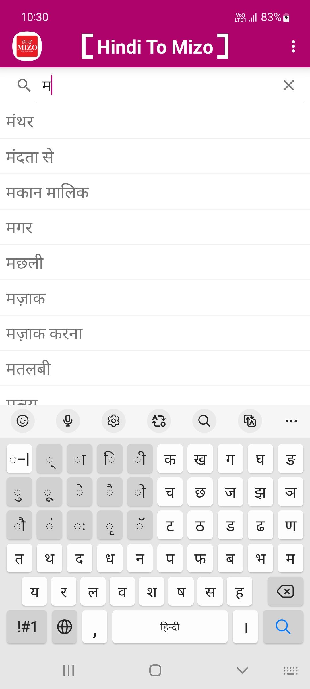 Hindi To Mizo Dictionary is a Mizo dictionary enabling to search in both languages i.e you can search Hindi words for their meanings into Mizo language or you can search Mizo words for their meanings into Hindi language.