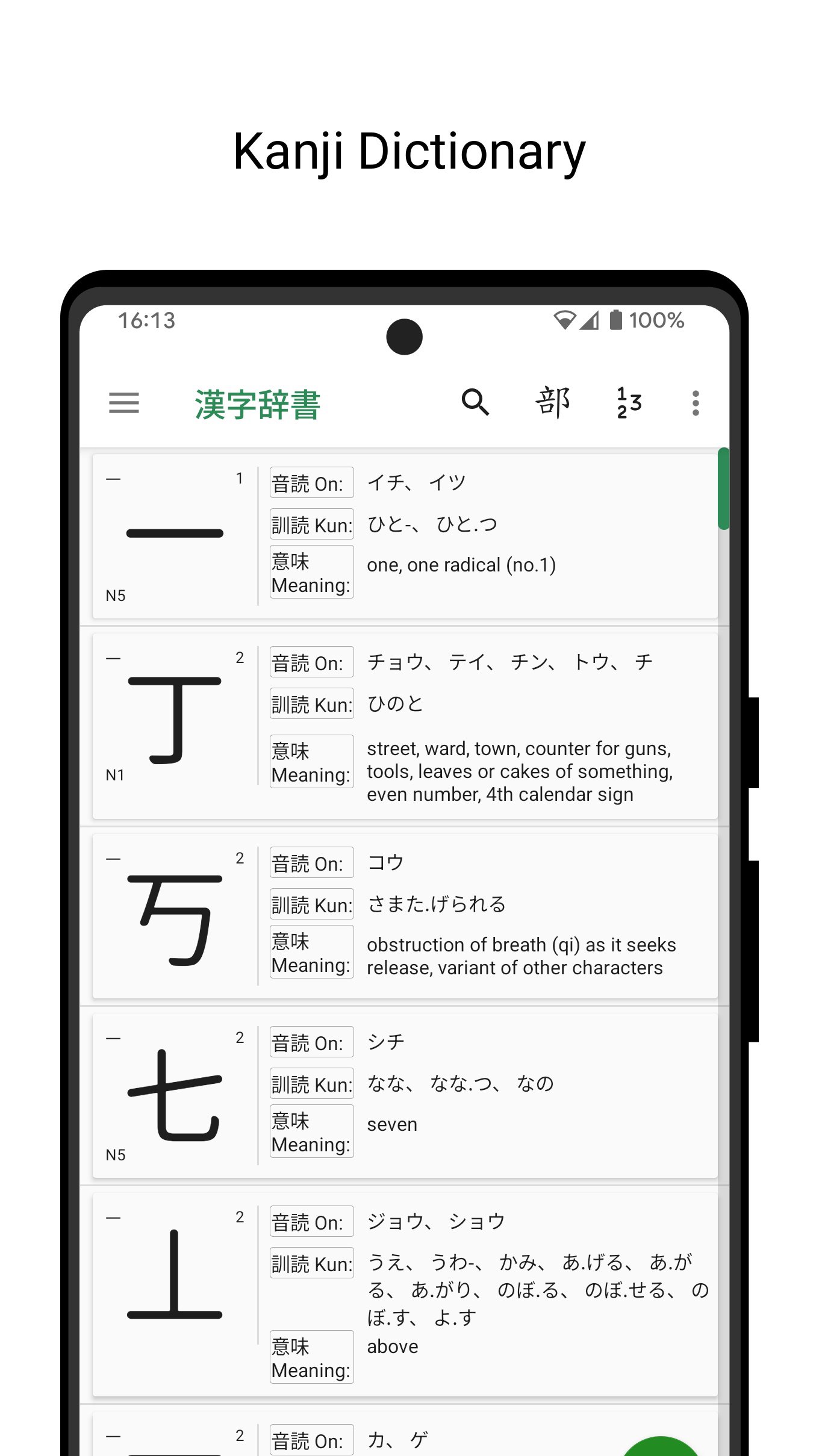 Our Japanese Dictionary is tailored for learners at the initial stages of learning how to write Japanese Kanji, offering an intuitive and user-friendly experience. Whether you're studying for JLPT or simply exploring Japanese, this app is a must-have for building your Kanji knowledge.