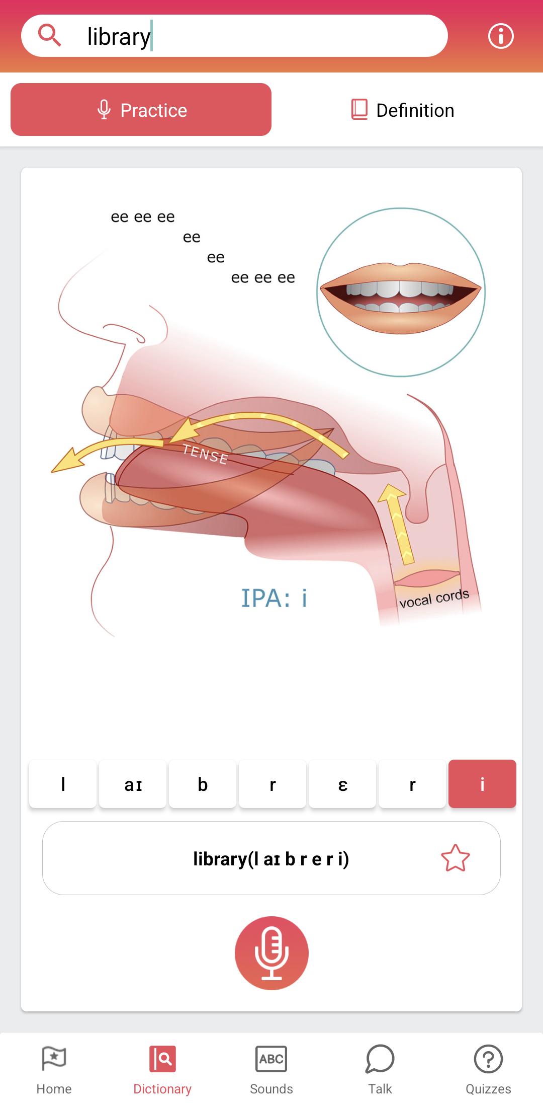 ∙ Users can make voice recordings, get voice recognition feedback and save their recordings to track progress or share with teachers and friends.
