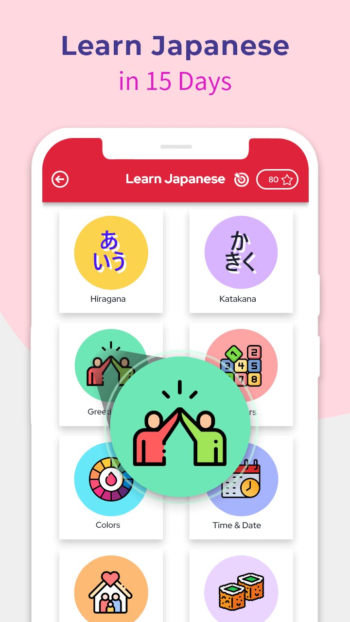 Learn Japanese hiragana, katakana, numbers, greetings, conjunctions, pronouns, prepositions, objects, verbs, adverbs, interjections, nouns, adjectives, body, months, days, daily routines, colors, flowers, food, fruits, family, clothes, animals, country and many more.