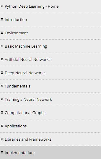 "Python Deep Learning - Introduction","Python Deep Learning - Environment","Python Deep Basic Machine Learning" , "Artificial Neural Networks" , "Deep Neural Networks" , "Python Deep Learning - Fundamentals" , "Training a Neural Network" , "Computational Graphs" , "Python Deep Learning - Applications" , "Libraries and Frameworks" , "Python Deep Learning - Implementations"