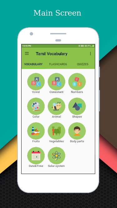 Application teach you to read, speak, listen and write Tamil Vocabulary (Tamil Word, Tamil Category, Tamil Phrase, Tamil Phrasebook, Tamil book, Tamil wordbook ).