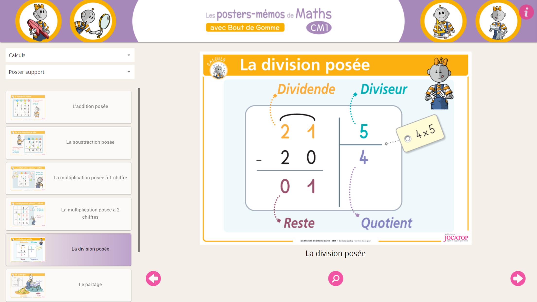 The essentials of the CM1 mathematics program are covered through 40 paper posters, animated by the characters of Bout de Gomme, Tirobot and Robotine. Three types of posters are available: