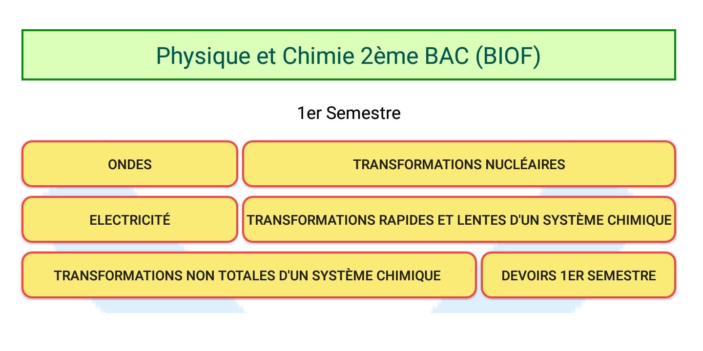 This application contains courses in Physics and Chemistry (BIOF) intended for students of 2nd Scientific Bac, summaries of all lessons and corrected homework without Internet.