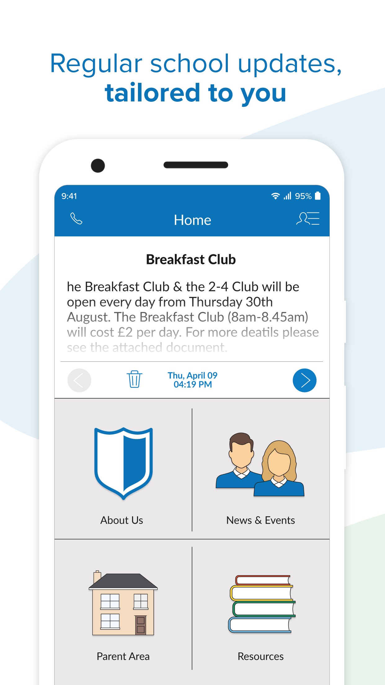 The app provides a set of content areas that the School can use to publish key information content such as school policies, educational materials, timetables, canteen menus, etc.