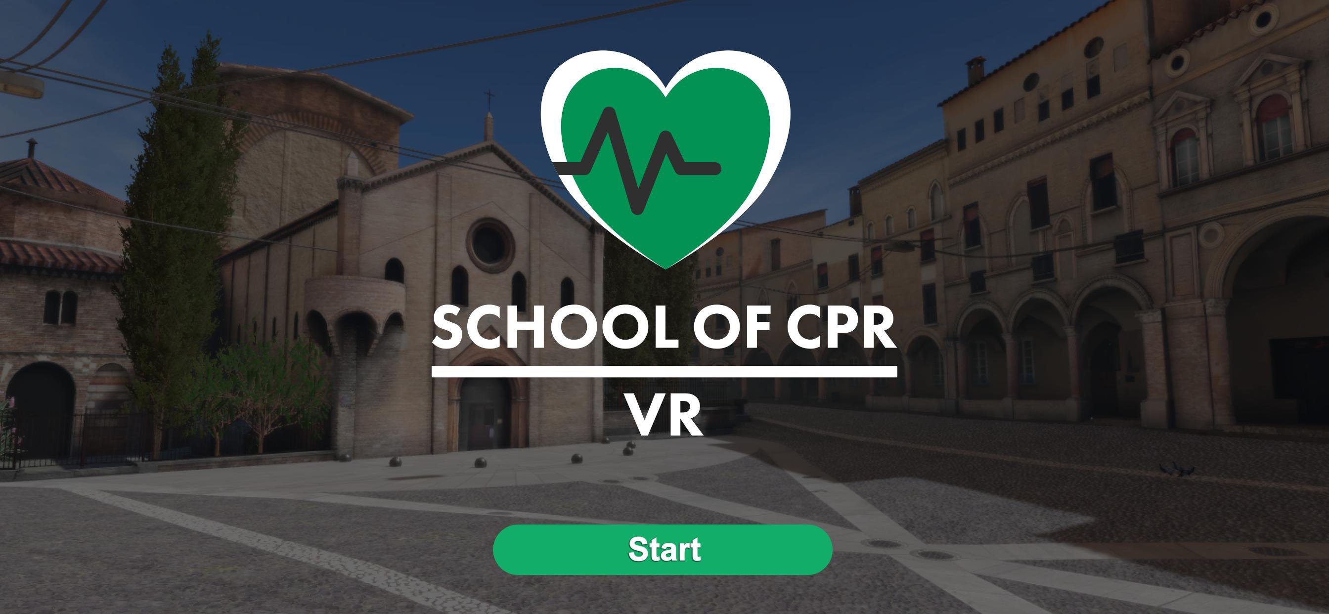 School of CPR VR is an innovative project developed in virtual reality for smartphones. The principal aim is to increase awareness, inform and train on the maneuvers to be performed in the event of cardiac arrest in adults and children. School of CPR VR includes two different scenarios: out-of-hospital cardiac arrest in adults in a prestigious location such as Piazza Santo Stefano in Bologna and pediatric cardiac arrest in a school. The user is guided through the specific scenario: consciousness evaluation, assessment of breathing, call for help, CPR, and use of an AED. The goal is to adequately answer the various questions correctly in order to proceed in the resuscitation of the patient victim of cardiac arrest.