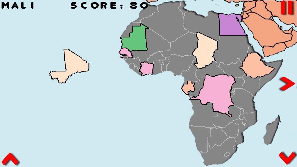 Map puzzle. Learn geographical locations of countries. Locate the moving country on the continent by arrows or touching upper and lower half of the screen or using drag and drop. In training mode you can select the continent. In play mode 5 continents appear randomly and moving speed increases.