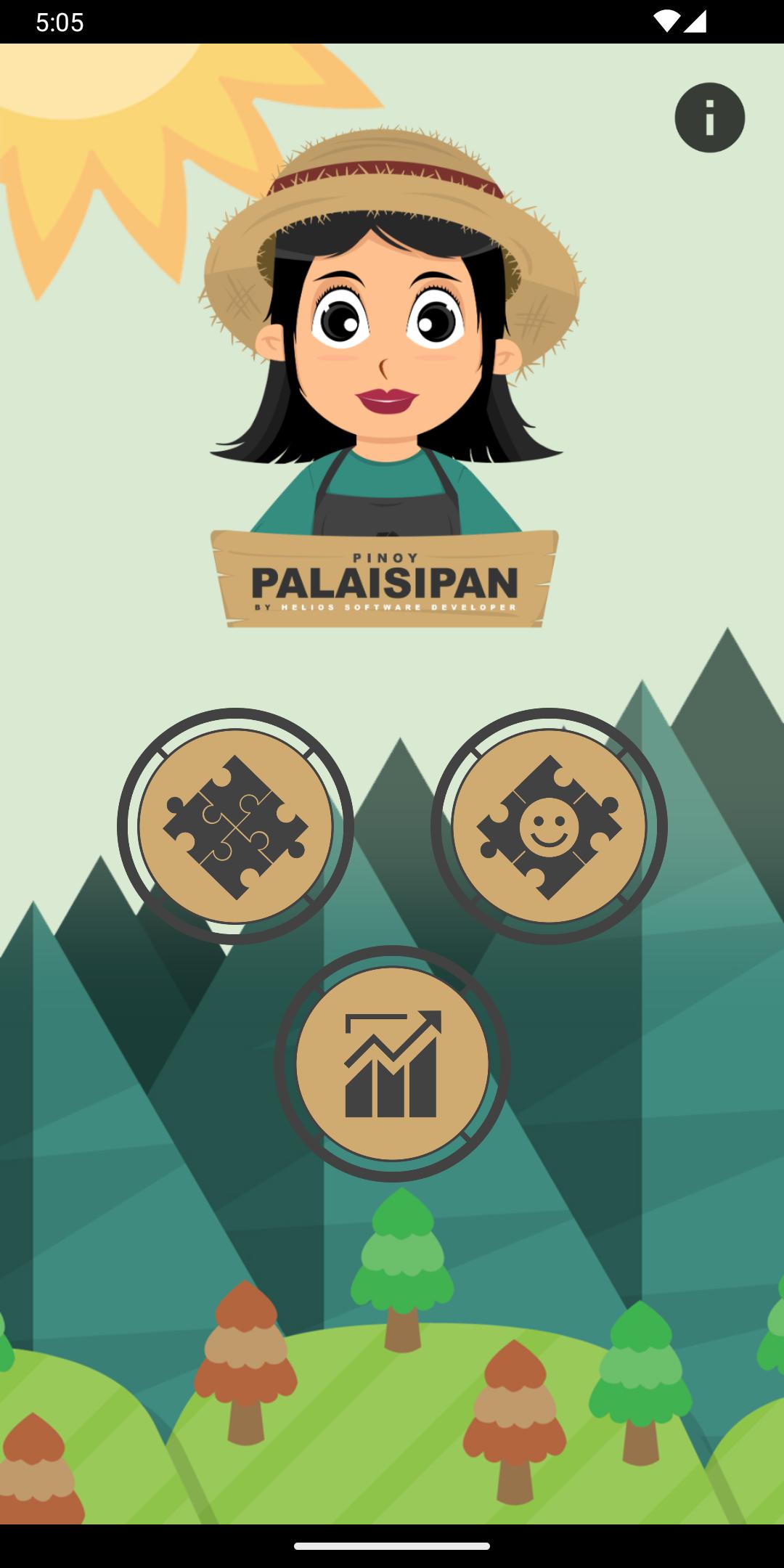 Pinoy Palaisipan is an educational mobile game that showcase filipino culture. It has 3 categories: Bugtong, Salawikain, and Sawikain. The user can guess the answer using the provided jumbled letters. He/she can also ask for help on facebook by sharing the question. The user also has an option to open up the answer using coins if he/she or his/her friends can't answer the question.