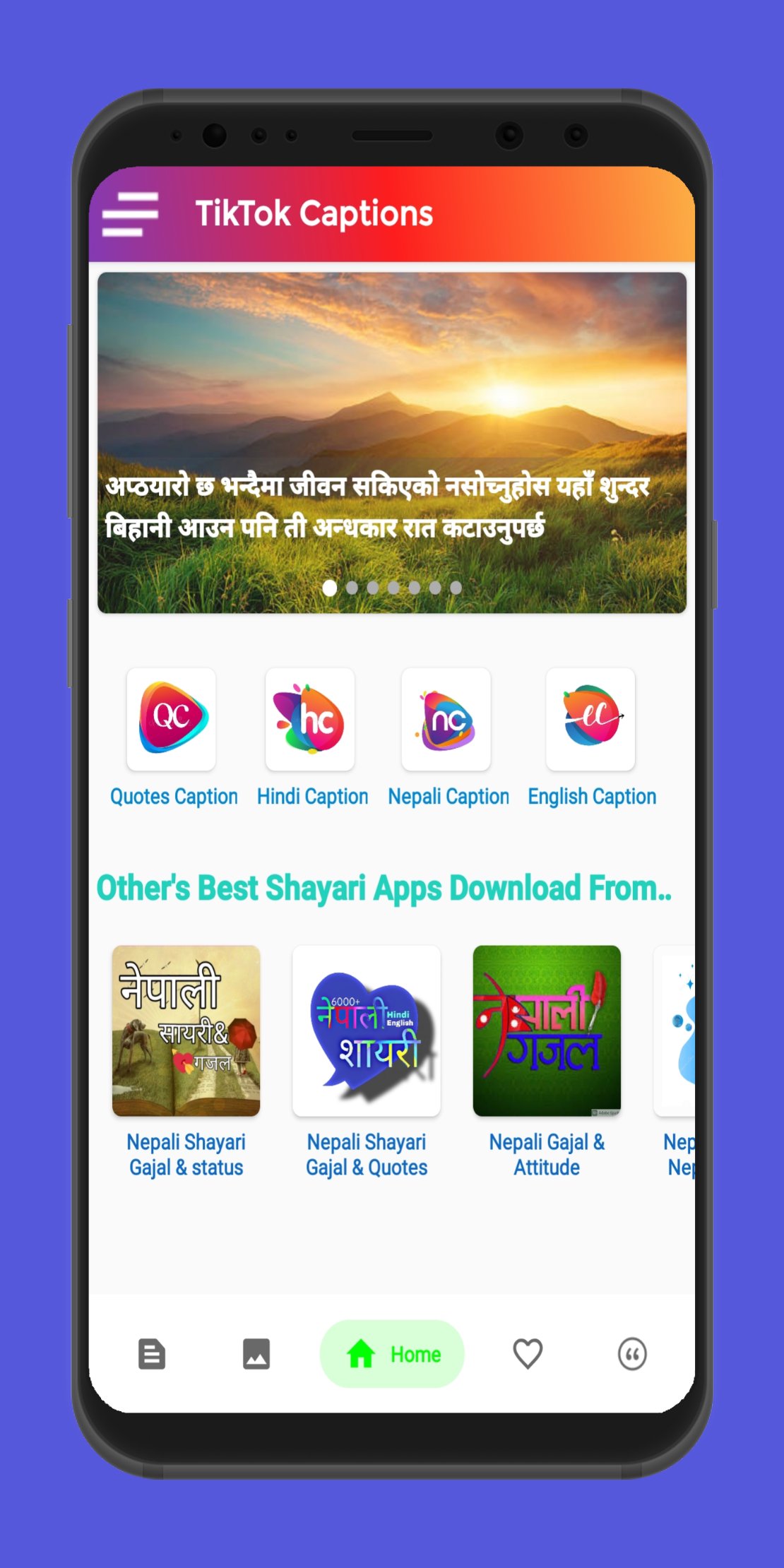With this application, you can enjoy 10000+ Nepali Status, English Captions, Hindi Captions, Captions in different categories. You can use these captions on different social medial like Facebook, Instagram, tiktok etc, and more likes and followers or increase social media engagement.