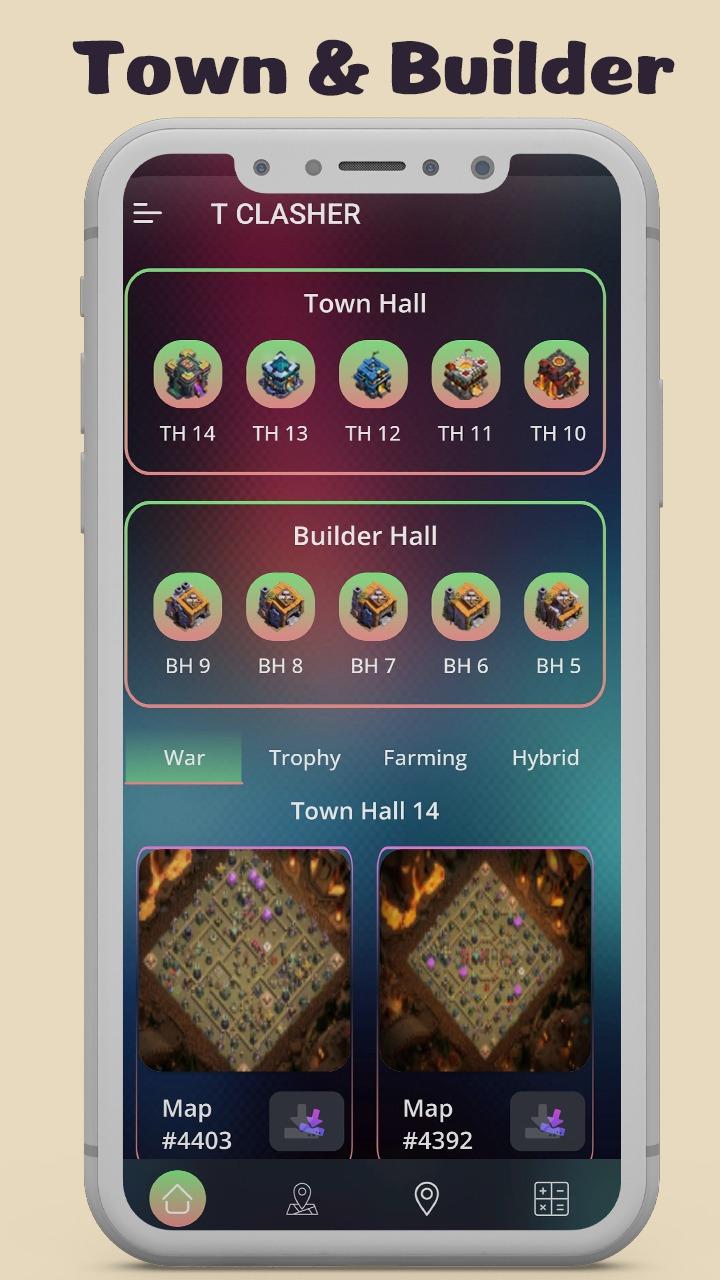 -Town Hall from 4 to 14 (TH4, TH5, TH6, TH7, TH8, TH9, TH10, TH11, TH12, TH13, TH14), War, Farming, Trophy, Hybrid