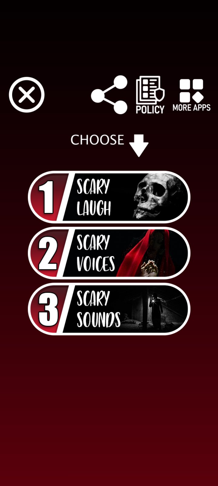 - Choose one of 3 sections of sounds (scary laughter, scary voices, scary sounds) in the main menu