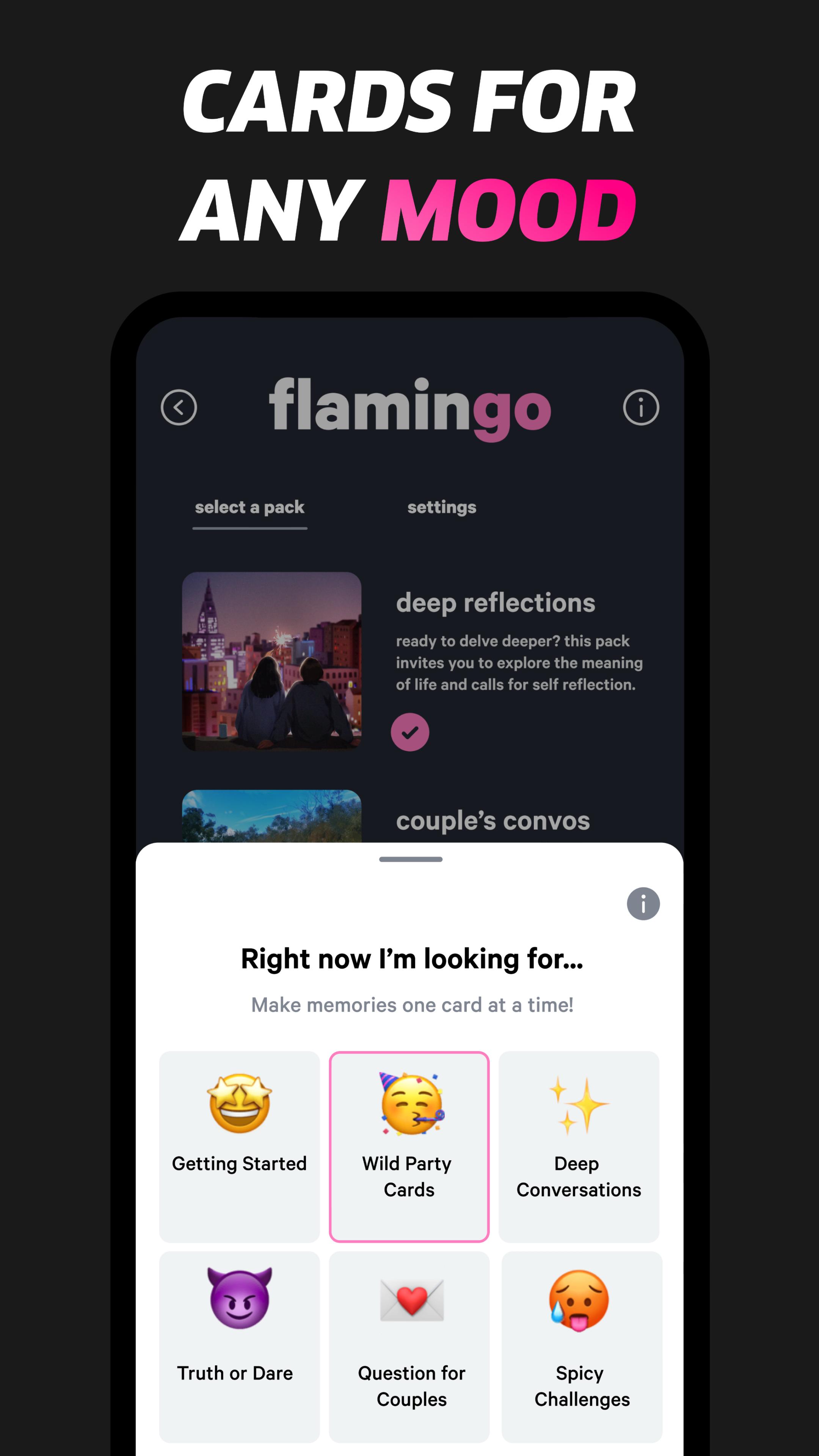 All you have to do is add your friends and let flamingo cards excite your night. This game is designed to spark convos that will leave you on the edge of your seat, craving for more! Forget the boring, bland, and weird party games, and introduce flamingo cards to your daily life. Filled with cards that will create long-life memories for you and your friends. We created this game because no other game is as interesting and speaks for the modern conversational experience, like flamingo cards does.