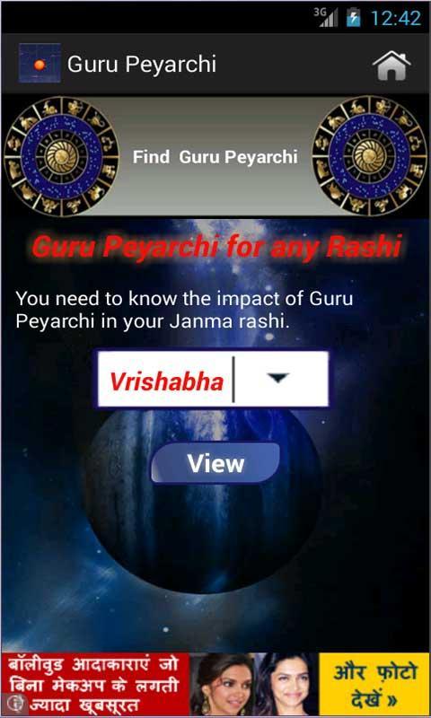Jupiter transit otherwise called as Guru Peyarchi. Guru in Indian astrological terms is regarded as the most auspicious planet among all the 9 planets, because of its abilities to bestow goodness for all life forms. It is a planet or graha that protects us from the evil cosmic forces and the bad karmic energies that are generated due to our series of birth here on this earth. You can get the following results Guru peyarchi against Rashi / rasi. Gurupeyarchi against moon signs and Guru peyarchi for a given year.