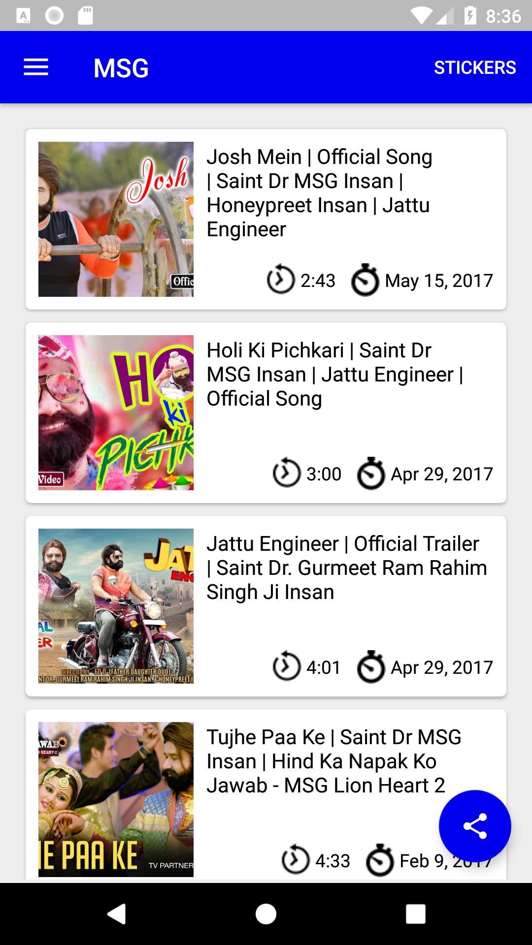 MSG is an app which contains Video song from Youtube of Movies by Saint Gurmeet Ram Rahim Singh Ji Insan. It also contains featured stickers for the same for use in WhatsApp Chats.