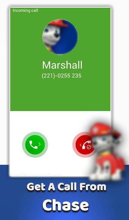 A Call From Paw Marshall Patrol is a fake call simulator that let all paw patrol lovers able to simulate fake call from Marshall and talk to paw patrol Marshall on the phone and prank your friends.