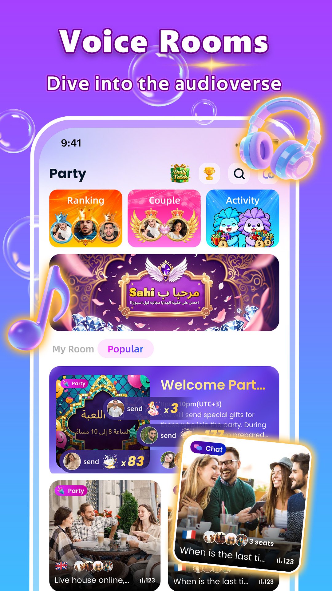 Party rooms for singing, games, and more! Meet people who share your interests. New themed rooms daily—always something fresh to explore!